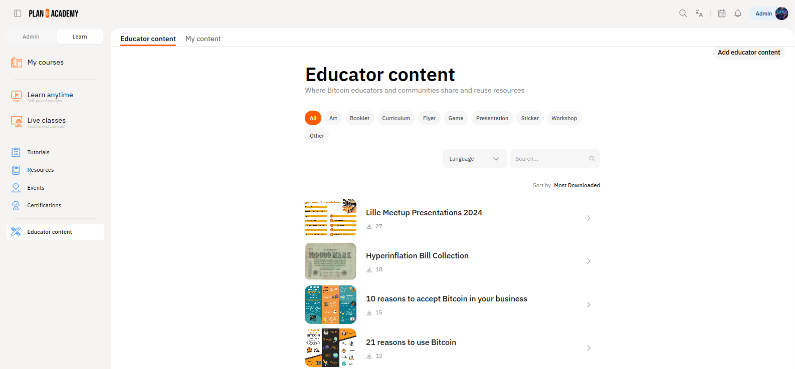 Plan ₿ Academy now offers a dedicated space for Bitcoin educators to share and access educational resources created by the community, for the community. We know educators put tremendous effort into creating presentations, flyers, and workshops, often recreating resources that already exist elsewhere. This section helps educators support each other and reduce duplicated work. Be stronger together.